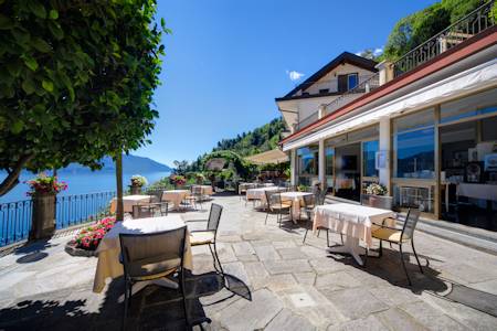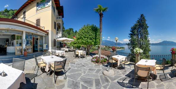 Du terrasse-jardin est possible jouir charmante vue panoramique du Lac Majeur ; une excellente occasion pour goûter au mattin un riche petit déjeuner buffet et au soir à un dîner romantic, en choisissant votre personnel menu en tant que le divers buffet de produits naturels.